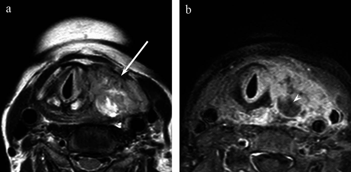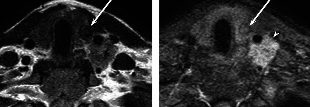 MRI is sensitive in detecting suspicious lymph nodes in the neck1,15,16. Enlarged or abnormal appearing nodes may indicate metastatic spread, necessitating further evaluation or biopsy.
